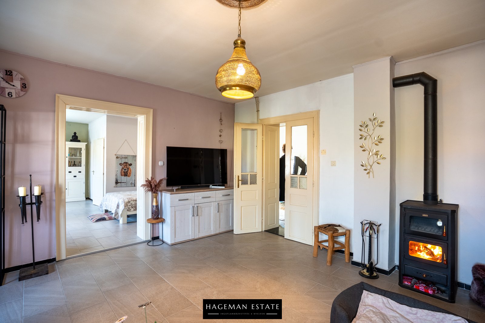 - Tágas nappali (~30 m²) fatüzelésű kandallóval