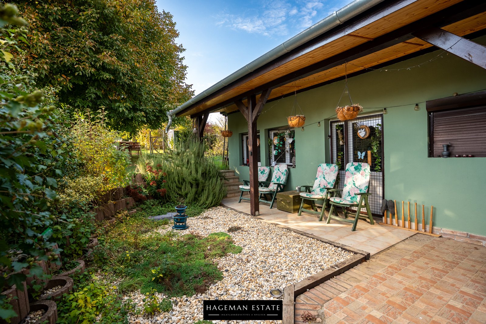 A kertben fedett medence és tíz konyhakerti ágyás kapott helyet a rendezett, mediterrán hangulatú udvarban. A fűtés gáz-cirkó rendszerrel (saját földbe telepített gáztartály) és fatüzelésű kandallóval történik.